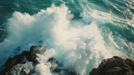 Aerial view of vibrant ocean waves forcefully crashing against rugged coastal cliffs, showing nature's raw power and beauty.