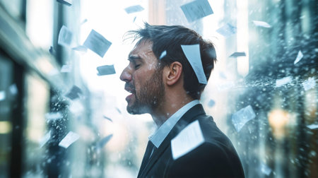 A businessman in a formal suit expresses frustration as documents swirl around him in a busy city environment, highlighting his emotional turmoil.