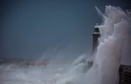 Giant waves batter the lighthouse & north pier guarding the mouth of the Tyne in Tynemouth, England