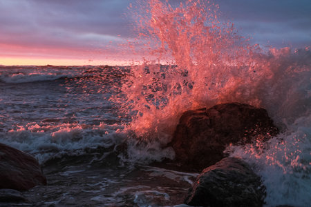 Splashes of water from the waves on the sea at sunset.