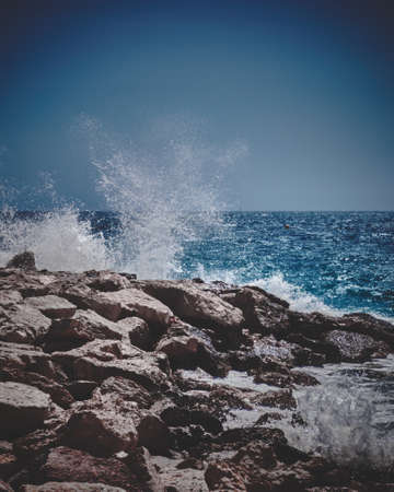 A vertical shot of the waves hitting the rocky shores captured in Cannes