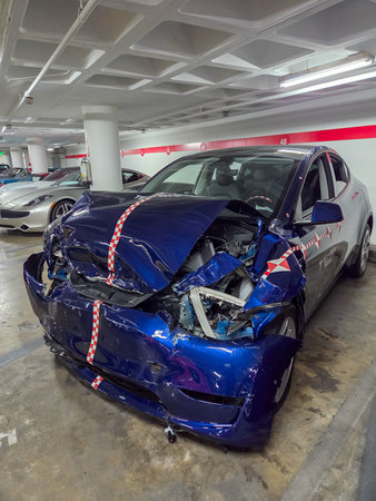 Los Angeles, USA - November 30, 2025: Petersen Automotive Museum. Tesla Model Y crash