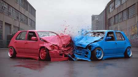 Two custom pink and blue hatchbacks collide head on on a grungy urban street, sending debris and paint splashes into the air amid twisted metal and scattered broken parts