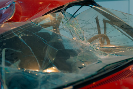 Car accident crash, Car accident protection, Claim collision, Auto emergency. Crashed car claim insurance. Warranty policy service. Serious problems. A red car with a damaged front end.