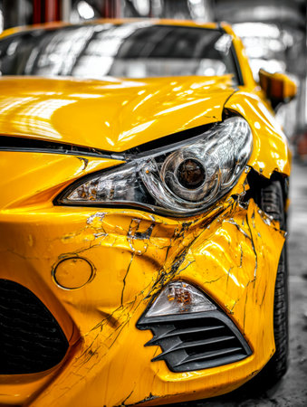 A vibrant yellow racing car with a shattered front bumper and noticeable dents rests in a dimly lit garage, conveying a sense of recent collision and repair anticipation.