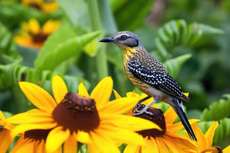exotic bird perched on sunflower in tropical garden, created with generative ai
