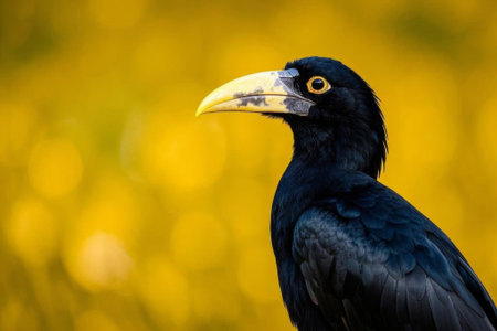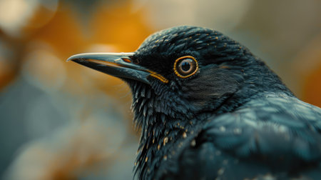 Detailed close-up of a common blackbird's head, highlighting its shiny black feathers