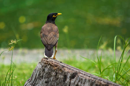Tropical noisy bird Common myna with black and brown plumage and yellow eyes and legs is walking on the lawn with green grass.
