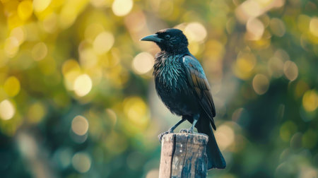 A black bird sits perched on top of a sturdy wooden post, surveying its surroundings. The birds feathers glisten in the sunlight as it remains still and observant.