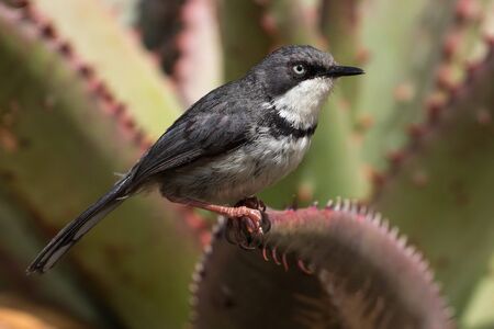 Bar-throated Apalis (Apalis thoracica) sitting on a cactus at Breede River, Western Cape, South Africa.