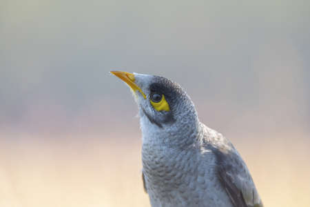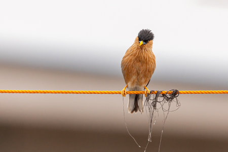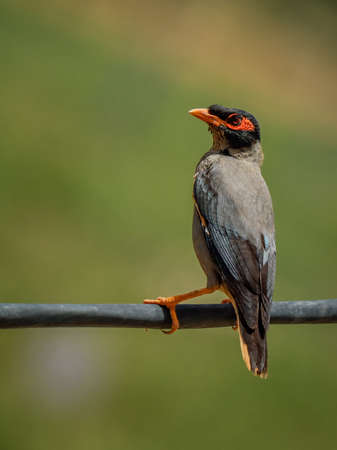 The Bank Myna (Acridotheres Ginginianus) is perching on black wire. bank myna is look like common myna, only differing in having brick-red naked skin behind the eyes instead of yellow.