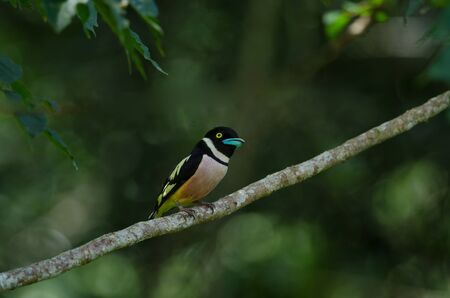Black and Yellow broadbills perches on a brunch (Eurylaimus ochromalus)