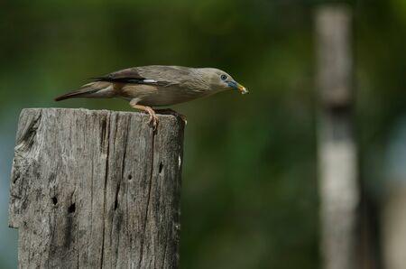 Chestnut-tailed Starling bird (Sturnus malabaricus) standing on the branch in nature, Thailand