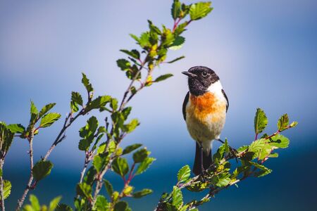 Siberian stonechat sits on a green branch of a bush in the Altai republic, Russia