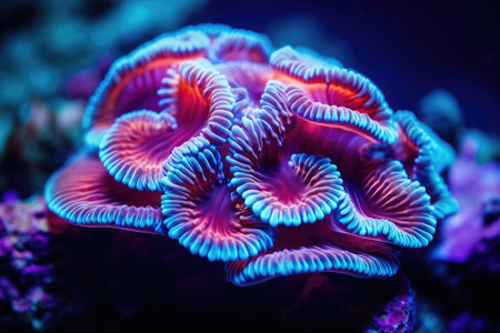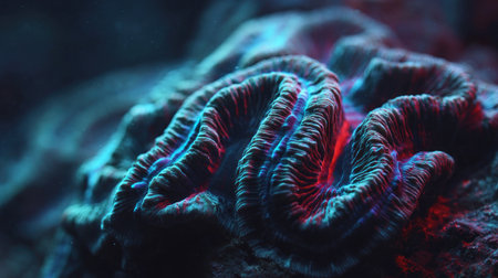 This close-up image presents a detailed view of textured coral, showcasing intricate patterns and forms. The macro composition highlights the organic shapes and surface details. Illuminated by blue and red lighting, the coral exhibits a vibrant display. Suitable for various creative and conceptual projects.