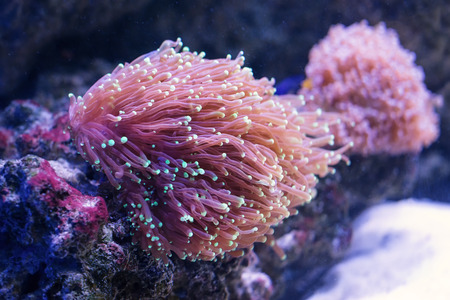 Beautiful sea anemones growing in the aquarium in Germany. Underwater scenery.