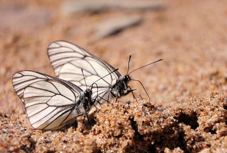 Two butterflies with white wings are sitting on the sand under the rays of the summer sun. Macro shot.