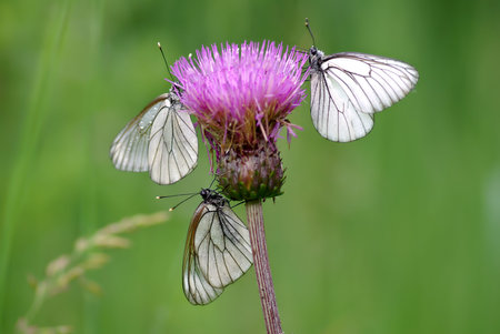 Trio Black-veined White butterflies (Aporia crataegi) in the pink flower
