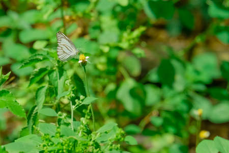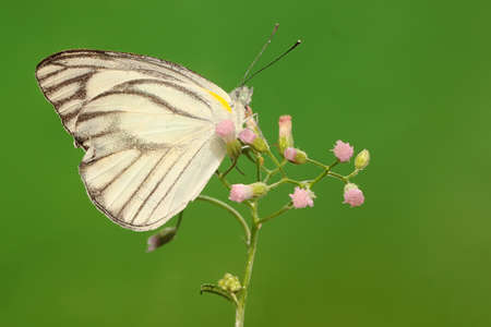 A butterfly is sucking the nectar of a wildflower. This butterfly has the scientific name Appias libythea.