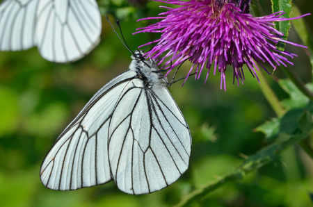 Two black-veined white butterflies on thistle flower at sunny summer day close-up view
