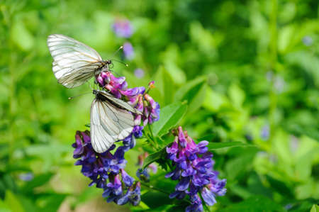 Two black-veined white butterflies sitting on flowers of wild vetch at sunny summer day close-up view