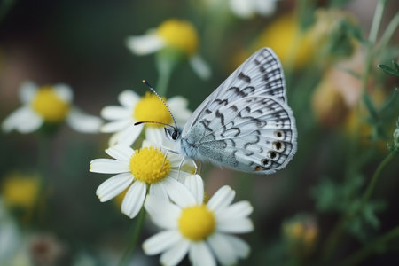 butterfly on camomile flower in garden, stock photo