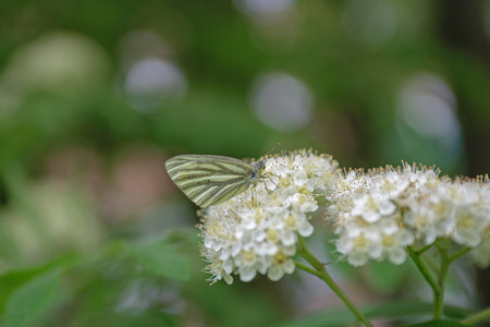 Green-veined white butterfly, Pieris napi, resting in a meadow hanging on a white flower foraging