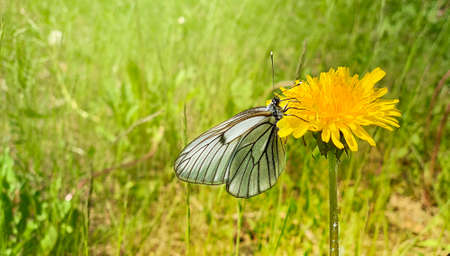 A white blue butterfly sits on a flowering yellow dandelion field flower on a green clearing with meadow grass drenched in sunlight. Closeup on the right. Spring summer.