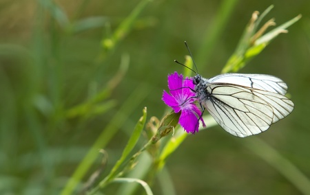 white, striped butterfly sits on purple wild carnation