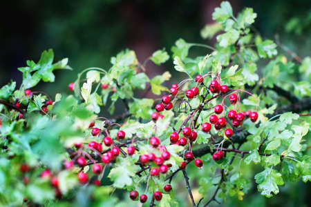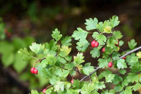 Branch of wild ripe hawthorn - Crataegus - in the forest. Red berries on deep green nature background.