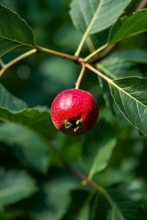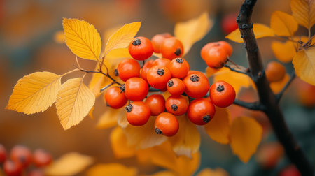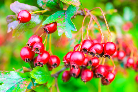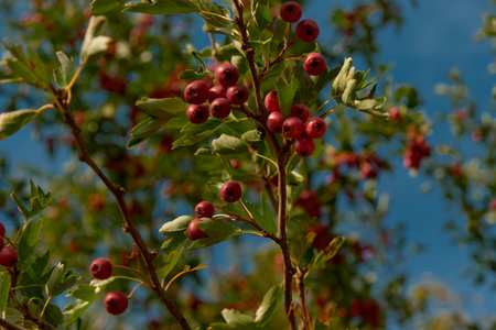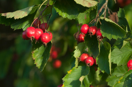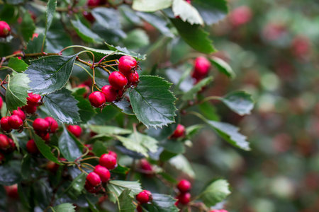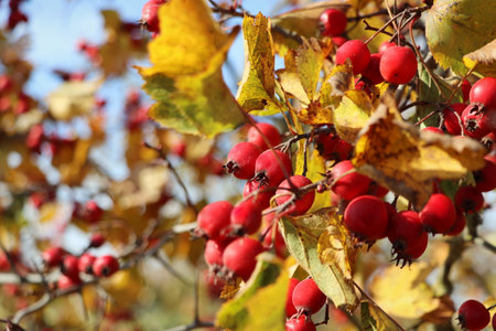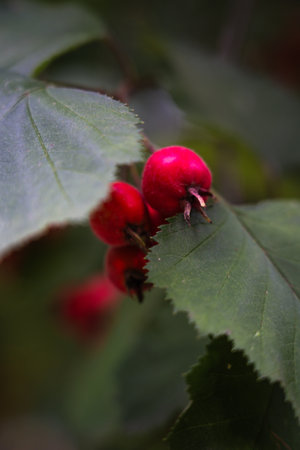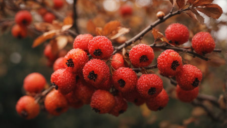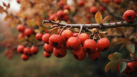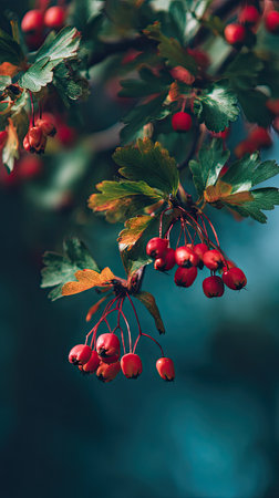 A detailed macro shot capturing the vibrant red hawthorn berries in their autumn splendor. These ripe berries are not only beautiful but also have medicinal properties.