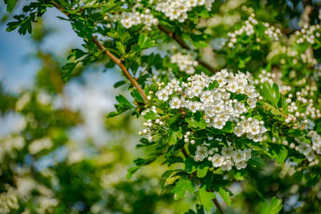 Hawthorn blossom branches with young leaves illuminated by sunlight in spring.