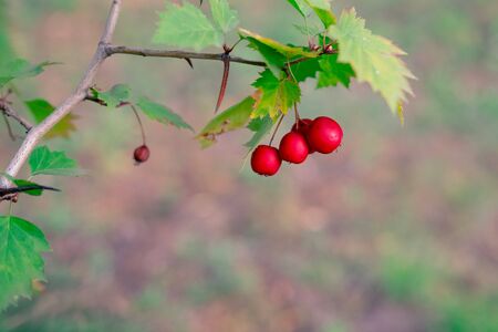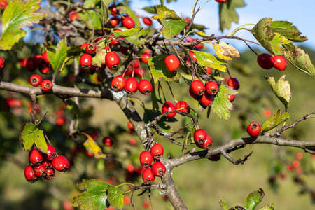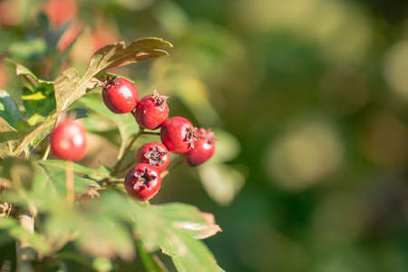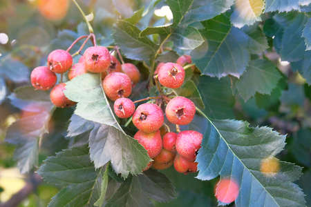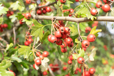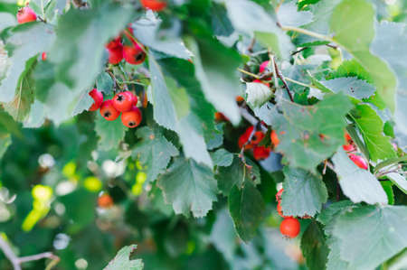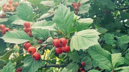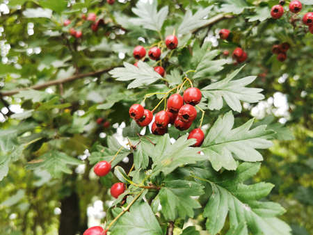 Mature hawthorn fruit hanging from branches in dense leaves. Natural seasonal background of health and natural illustrations. Macro photography of hawthorn fruit in green leaf background.
