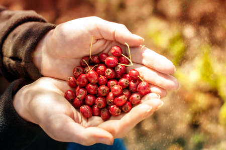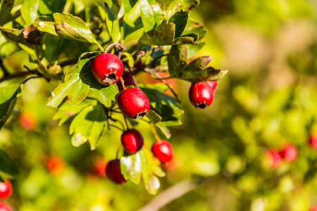 Red fruit of the hawthorn Crataegus, close-up. Crataegus, commonly called hawthorn, quickthorn, thornapple, May-tree, whitethorn and hawberry.