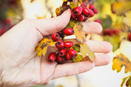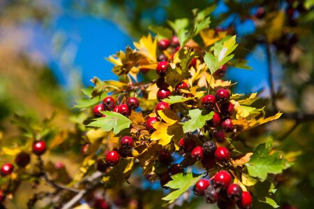 Branch of ripe hawthorn at sunny autumn day, close up.