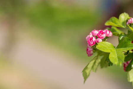 Beautiful pink hawthorn blossom. Sunny day. Spring background. Close up