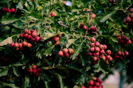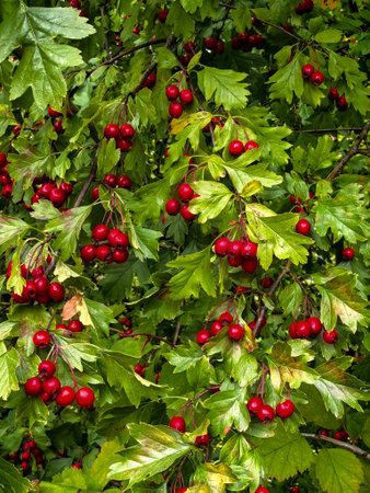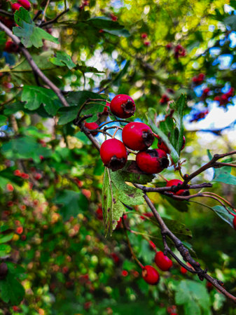 Hawthorn berries hang vibrantly clustered among dense green leaves, showcasing their rich red hue, captures the abundance of nature.