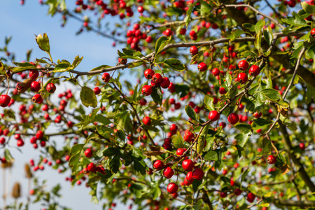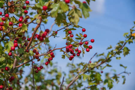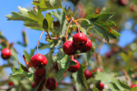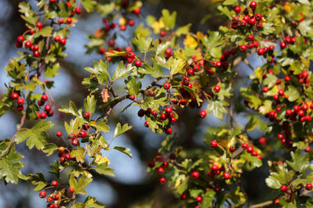Hawthorn Bush Red Berries. Bright sky background, green leaves, soft focus with sharp focu on the berries. Photographed in Repton Derbyshire UK in Autumn on a sunny day.