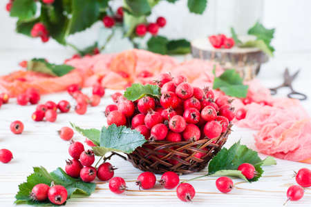 Red ripe berries of hawthorn branches with dark green leaves. Autumn harvest of medicinal plants. Small aperture, blurred background