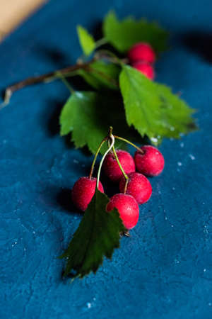 Red berries on a branch with leaves. Ripe hawthorn Fruit. Close-up photo.