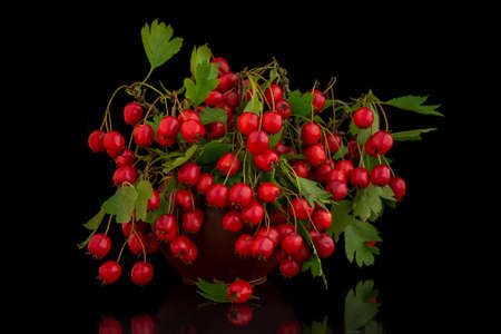 Sprigs of fresh ripe hawthorn berries on a black background. Close up. Copy Space