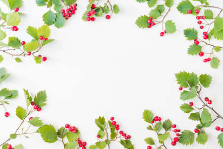 Single sprig of hawthorn berries with red berries and green leaves on clean white background, simple minimal styling
