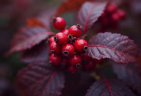Clusters of bright red berries hang delicately among rich burgundy leaves, showcasing nature's artistry. This striking display captures the essence of a serene garden in autumn's embrace.