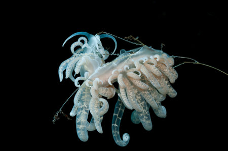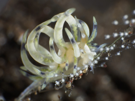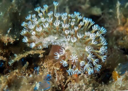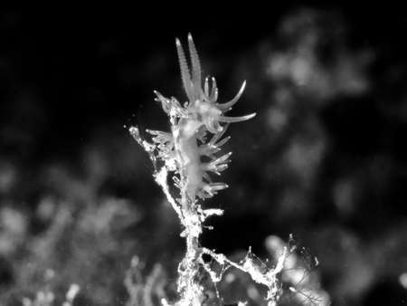 Several phyllodesmium iriomotense nudibranchs climbed on a coral, Bali, Indonesia