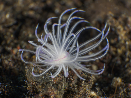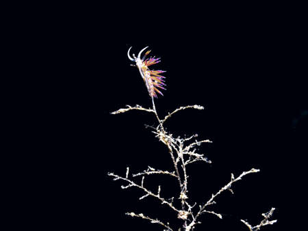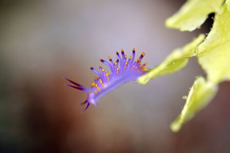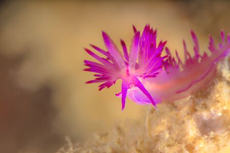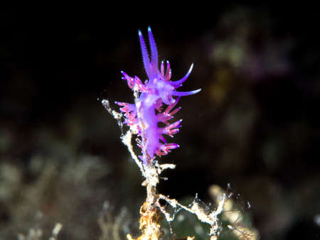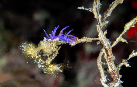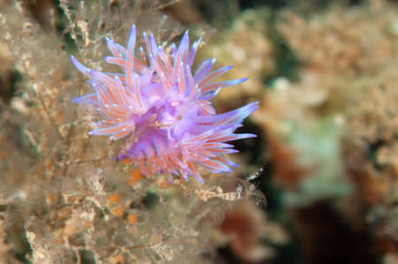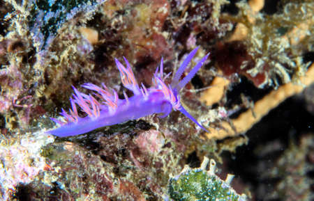 A beautiful sea slug in purple and white color. Nudibranch Flabellina in a tropical coral reef