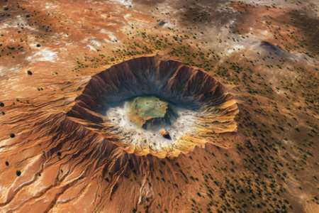 aerial view of a large meteor impact crater, created with generative ai