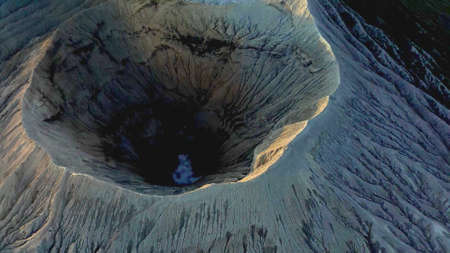 An aerian view of inside a big crater with smoke