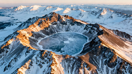 Captivating aerial shot showcasing a volcanic caldera amidst rugged earth tones, emphasizing the natural beauty and unique geological features of this remote landscape.