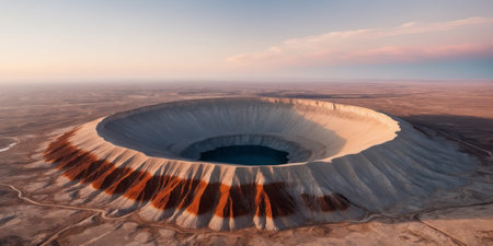 AI Generated. Aerial view of a massive crater in a barren desert landscape at dawn