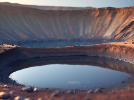 AI Generated. Water filled crater dominating martian landscape at sunset